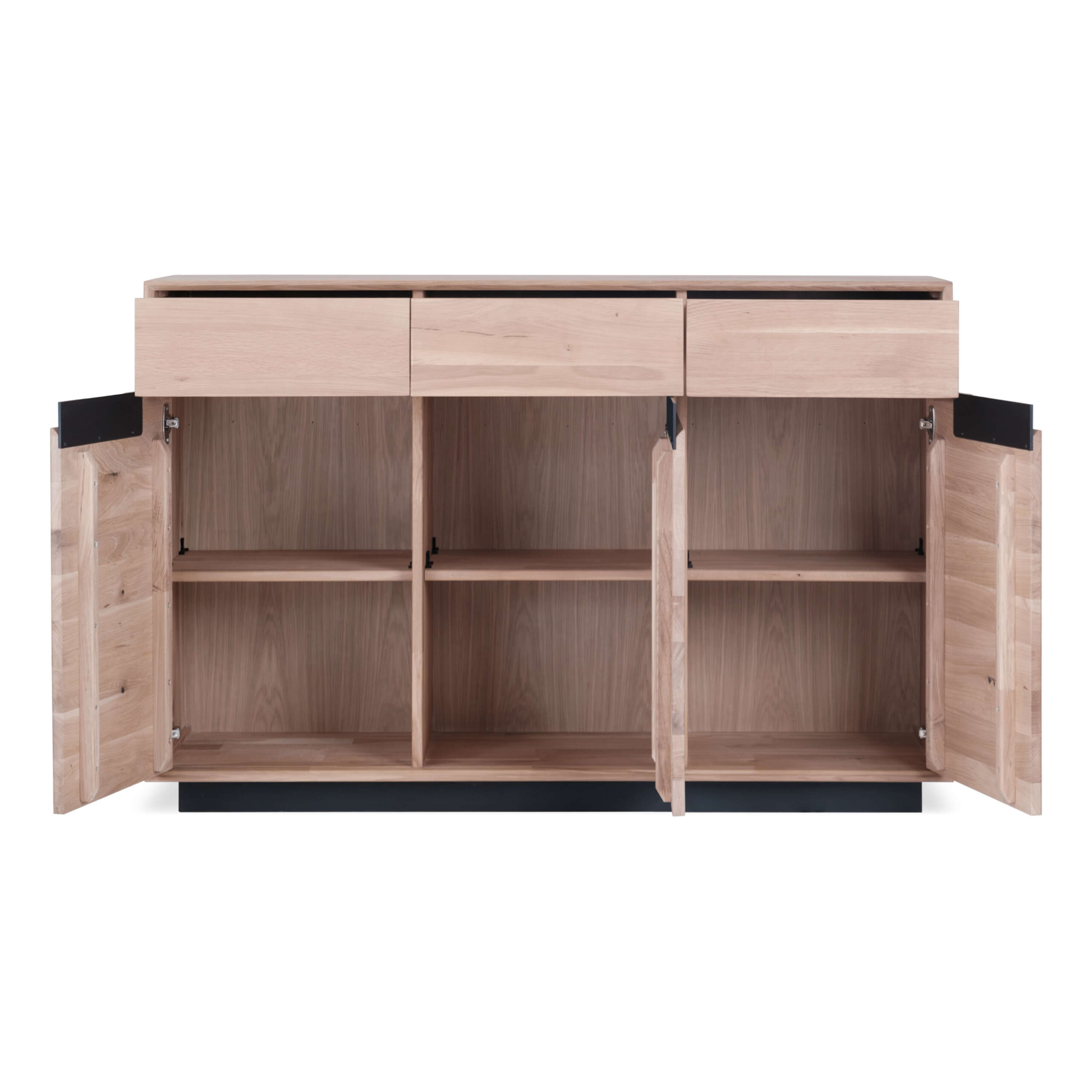 Dieses Sideboard aus massivem Eichenholz mit drei Türen bietet die perfekte Kombination aus Stauraum und elegantem Design. Aus sorgfältig ausgewählter Eiche gefertigt, vermittelt es ein Gefühl von Beständigkeit und Wärme. Schwarze, lackierte Holzgriffe betonen die moderne Linie des Möbels, während hochwertige Beschläge von Hettich ein leises und zuverlässiges Schließen garantieren. Mit Innenregalen und großzügigen Fächern ist dieses Sideboard ideal zur Aufbewahrung von Geschirr, Textilien oder anderen Haushaltsgegenständen – und bereichert dabei stilvoll jedes Wohn- oder Esszimmer.