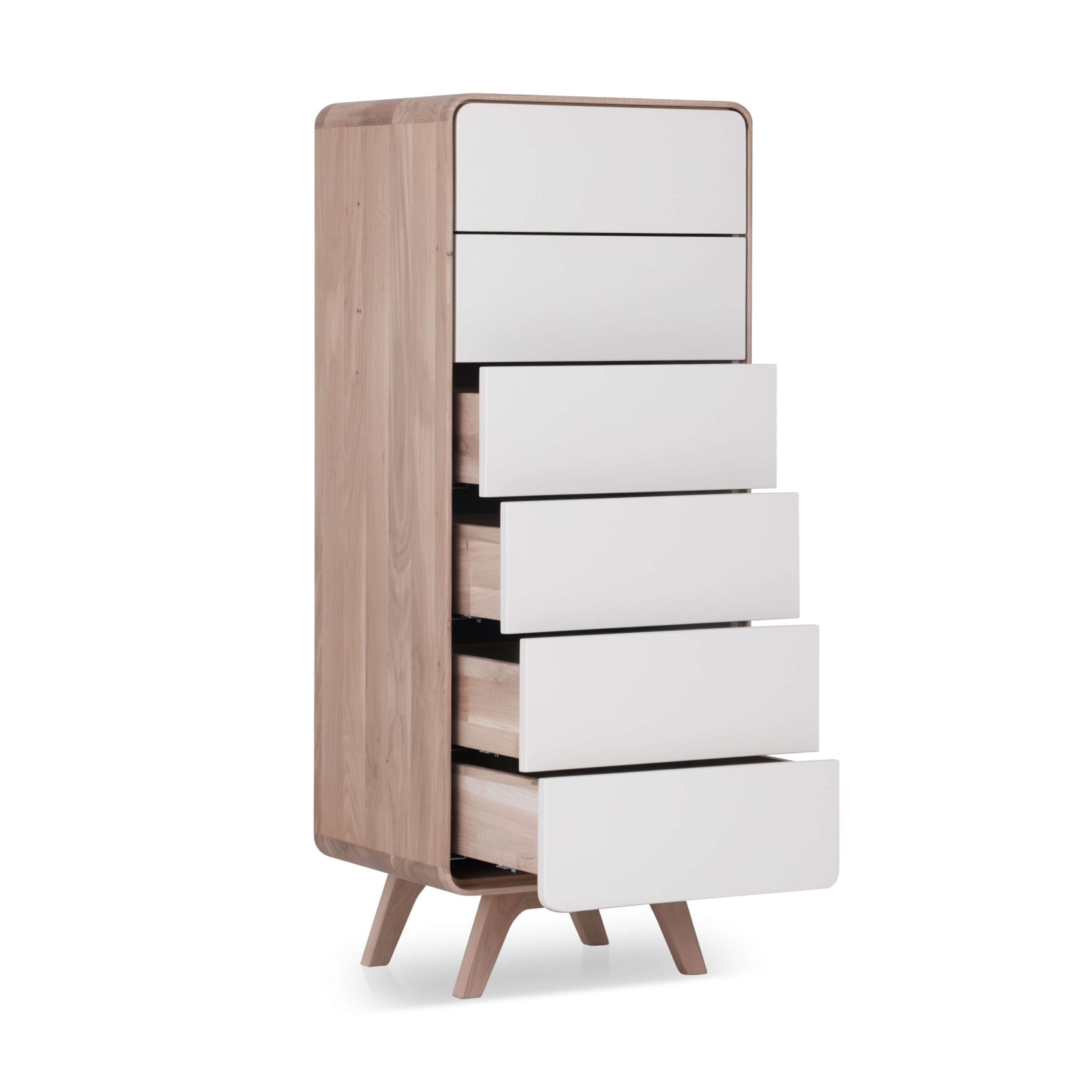 This version of the Avolo shoe bench, similar in form and function to the drawer units from the collection, offers a sophisticated and practical solution for everyday routines in the hallway or bedroom. Designed in the distinctive Avolo style, the bench combines a solid oak корпус, rounded edges, and a push-to-open system in a compact, low-profile format with an additional seating function.